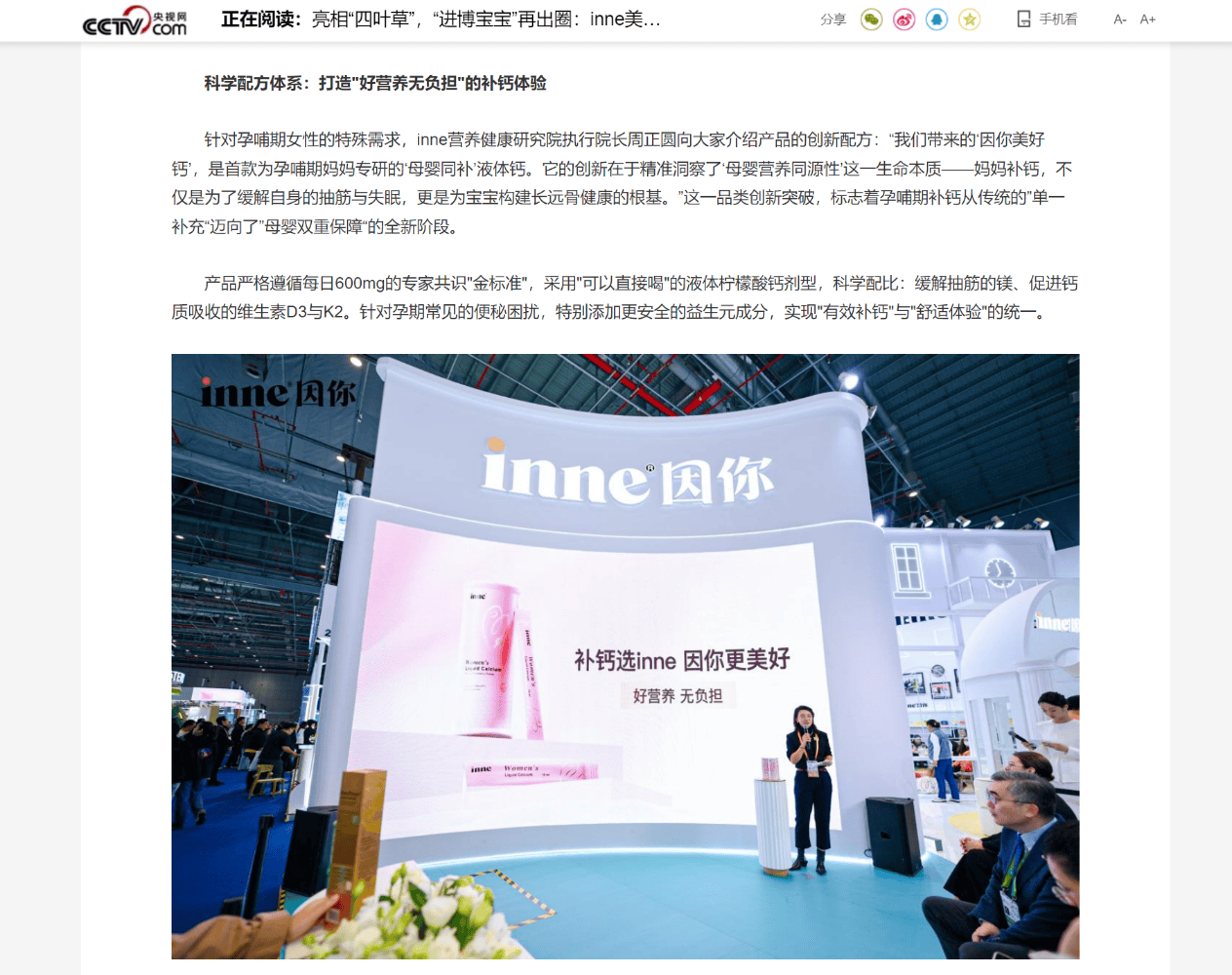 “进博会是全球创新理念的共振场,更是我们将‘全球科学实证体系’与‘中国家庭营养需求’深度对话的关键平台。”inne品牌代表Nathalie在央视采访中表示,“中国父母对下一代健康的极致追求,正持续推动全球营养品行业的创新进程。”