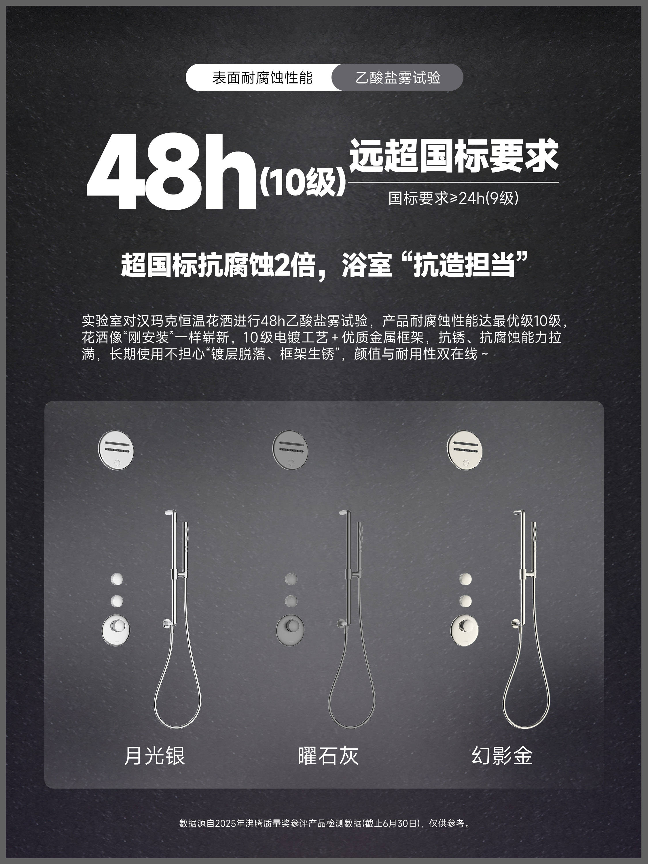 在工艺打磨上,汉玛克更将奢华质感融入细节:表面处理采用奢侈品同款PVD真空电镀工艺,形成致密保护膜,耐腐蚀性达到最高等级10级,经48小时乙酸盐雾试验验证,较国标24小时、9级的要求提升一倍,抗腐蚀能力是国标的2倍,即便在沿海高盐气候环境中,也能做到不易留水渍、耐刮擦,长久使用光亮如新。这种从材质到工艺的精益求精,既保障了产品的耐用性,又赋予其超越实用功能的奢华质感,完美契合高端用户“耐用与奢华兼具”的核心需求,这正是第一品牌深刻用户洞察的最佳体现。