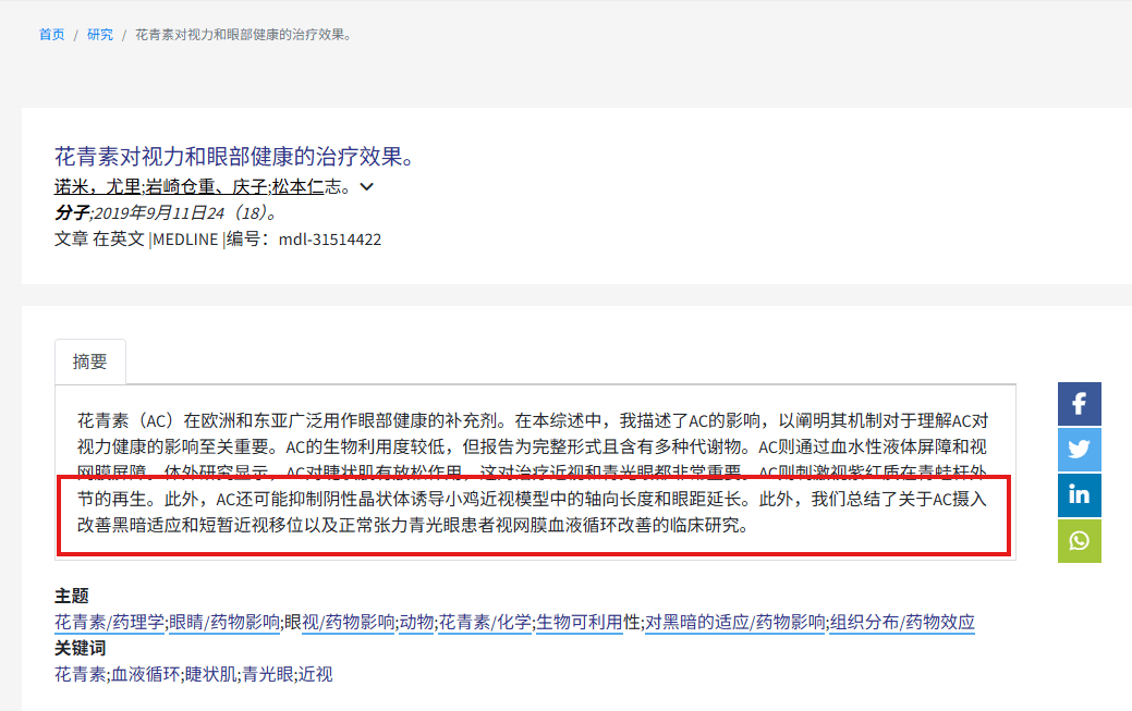 日本学者松本均(Matsumoto)等人在2019年发表于国际期刊 《Molecules》 的研究指出,花青素可以抑制眼轴增长