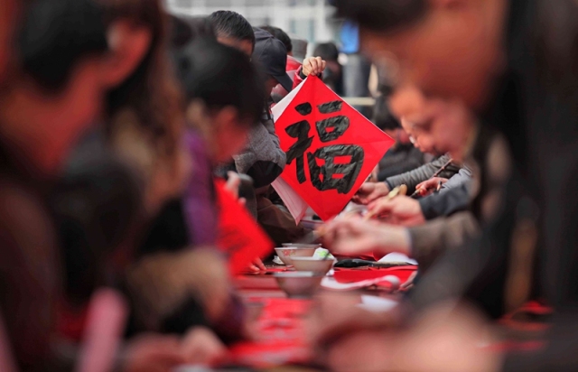 现场送“福”,这才是年的味道家中贴着“福”字春联,这还不够,快来迎财神!