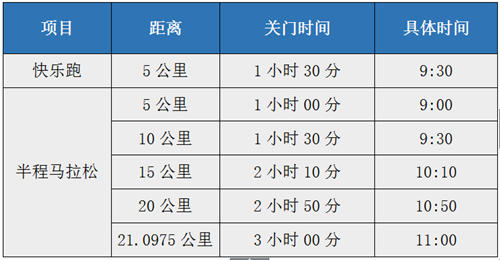 为了保证参赛选手比赛安全,限时对社会交通进行滚动封闭。比赛路线各段专设了赛事关门时间,到了关门时间,相应公里点的计时地毯停止工作,相应路段将恢复社会交通。在规定关门时间内,未跑完对应距离的参赛选手须立即停止比赛,退出赛道,以免发生危险。退出比赛的选手可搭乘沿途的收容车抵达终点。