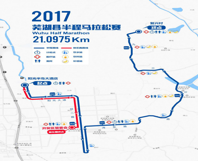 阳光半岛大酒店(起点)西次六路→阳光大道(德力西、飞科)→经二路→开发区管委会(快乐跑终点)→南湖路(安徽信息工程大学折返)→湾东路→九三公路→(花桥镇、香樟大道)→复兴村(终点)