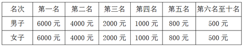 1、名次奖:根据枪响计时成绩录取男子、女子前十名,运动员分别获得奖金数额见下表(单位:人民币),并男、女前三名各颁发奖杯一座