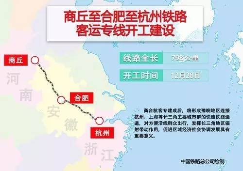 商合杭铁路线路起自河南省商丘市,途径安徽省亳州、阜阳、六安、淮南、合肥、马鞍山、芜湖、宣城8市,至浙江省湖州市接宁杭铁路客运专线至杭州,全线运营长度约为793.5公里,设计速度目标值350公里/小时。