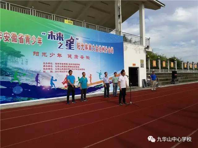 8月19日上午,2017年全国青少年“未来之星”阳光体育大会池州分会场开幕式在九华山中心学校体育场举行,池州市教体局姚潮朝勇、池州市教体局副局长计长生、九华山风景区经发处党组副书记洪流、青阳县体育局及经发处教体科相关负责人等领导出席开幕式并致辞。