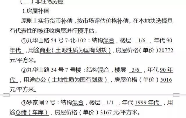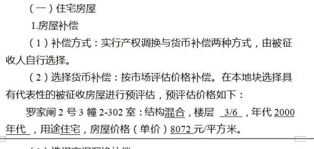 (2)选择货币补偿:按市场评估价格补偿。在本地块选择具有代表性的被征收房屋进行预评估。预评估价格如下: