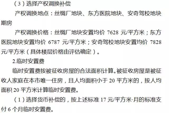产权调换价格:丝绸厂地块安置均价7628元/平方米;东方医院地块安置均价6787元/平方米(具体楼层价格由评估确定)。